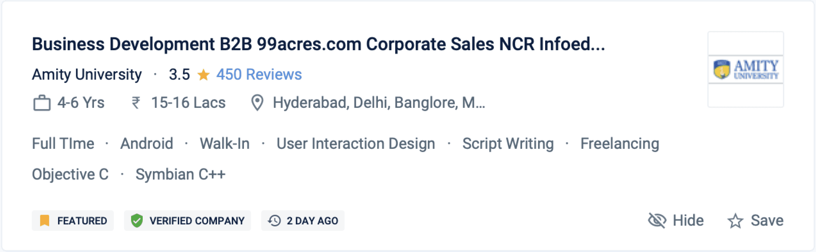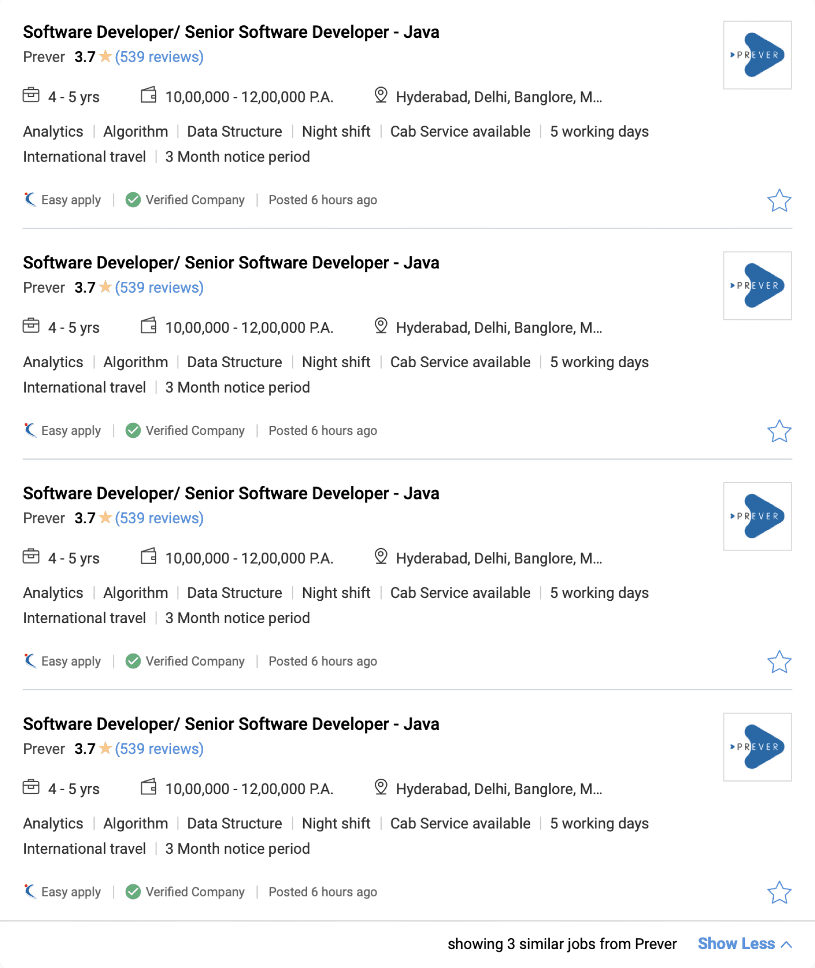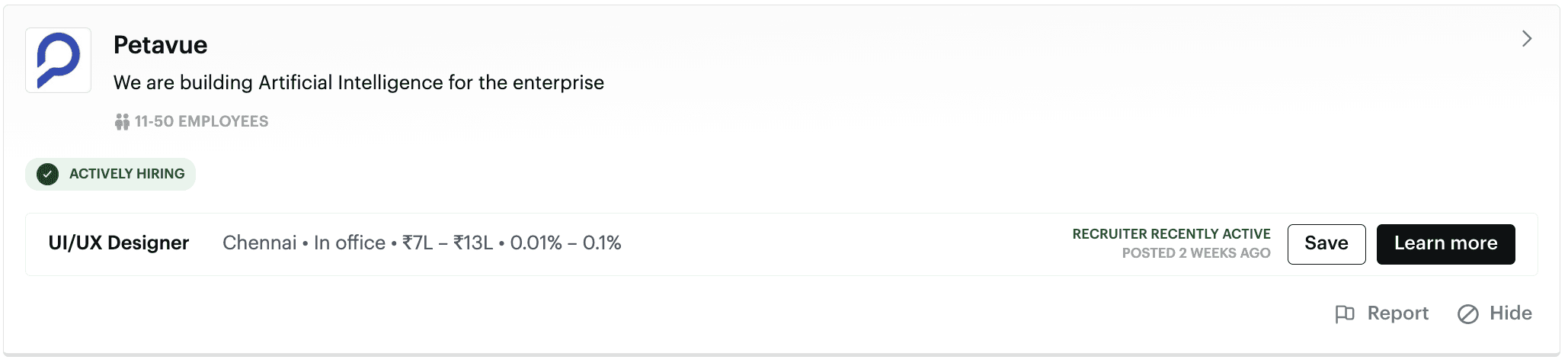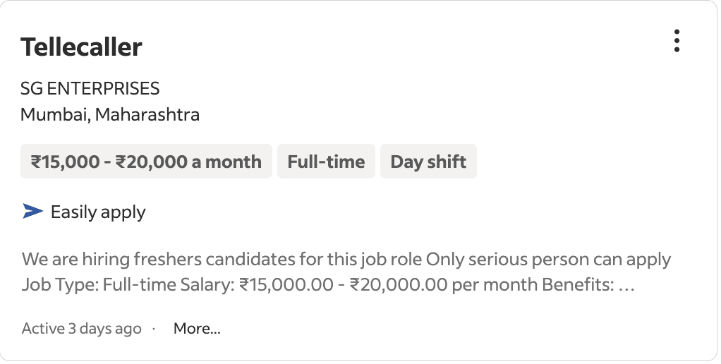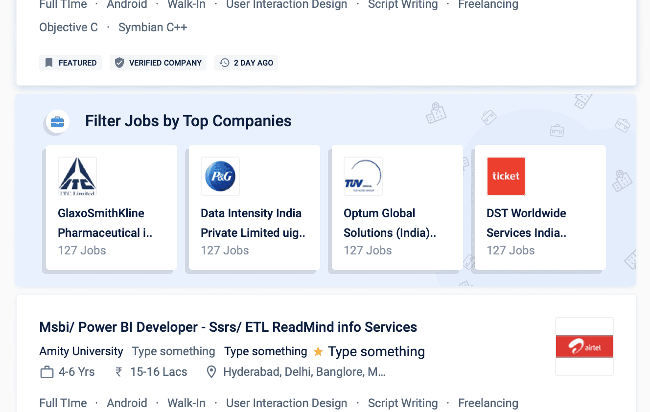 Incorporating various job card badges like, verified jobs, quick apply, government jobs will build user trust that jobs are verified or can be applied quickly.