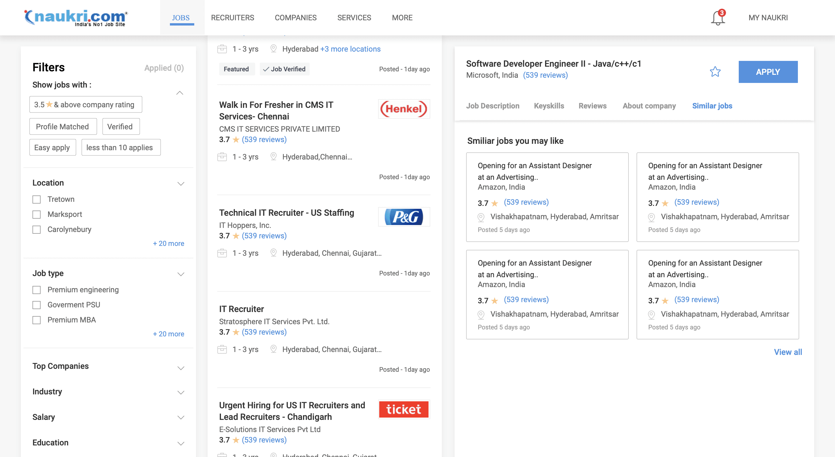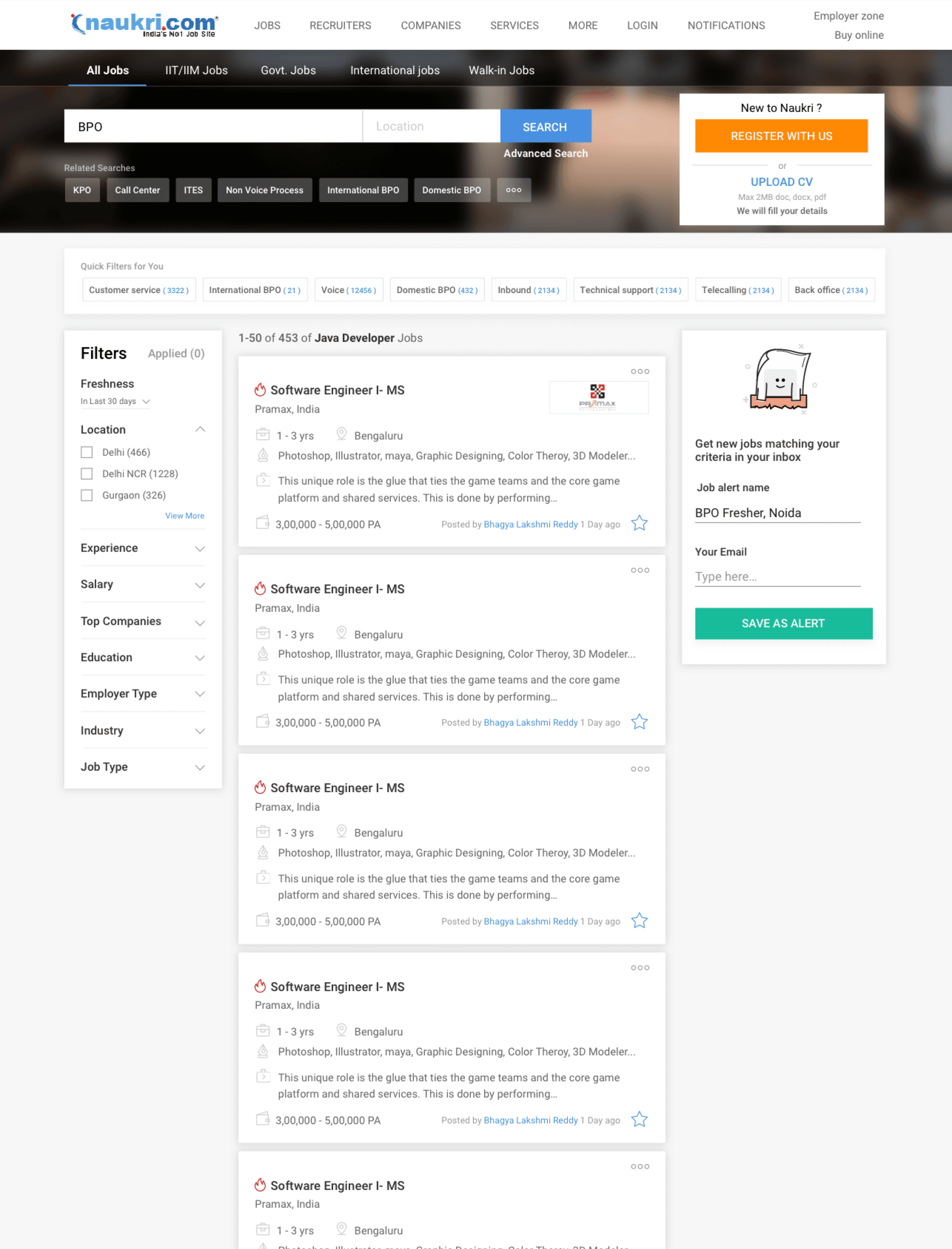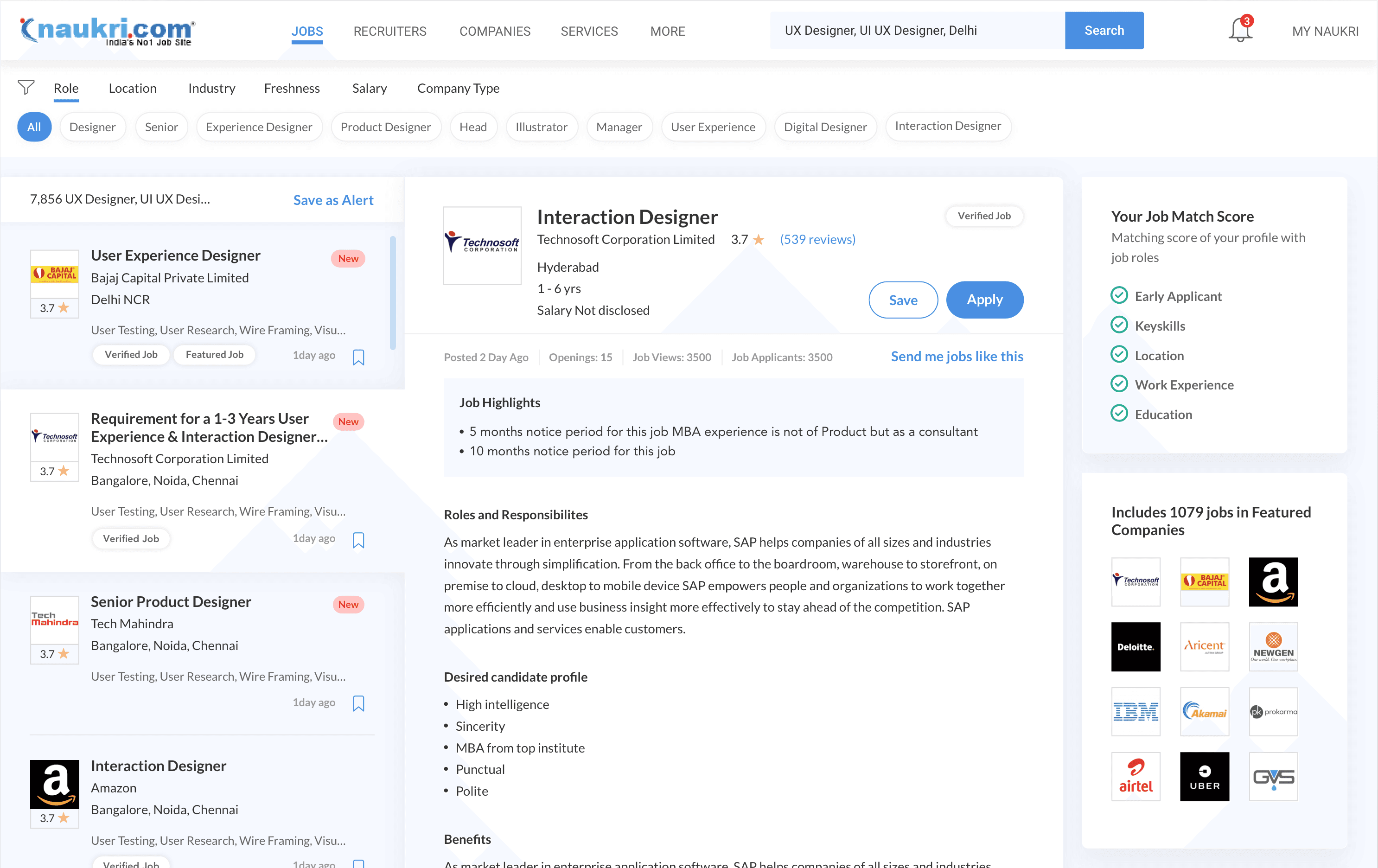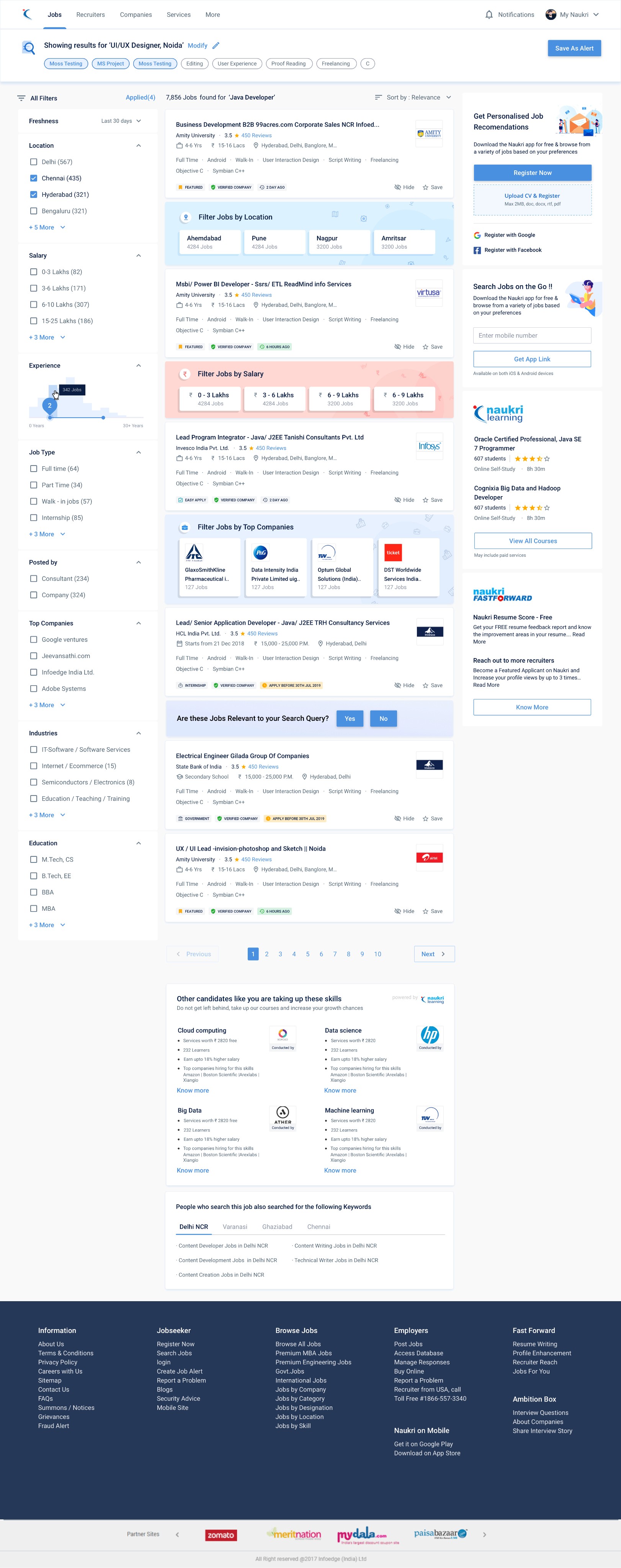 Naukri.com is an Indian employment website operating in India and the Middle East. In terms of user statistics, Naukri.com has a total of 21 million visits. The website ranks 2nd in the Jobs and Career and Employment category in India. i worked as UX designer in Naukri in job seekers division