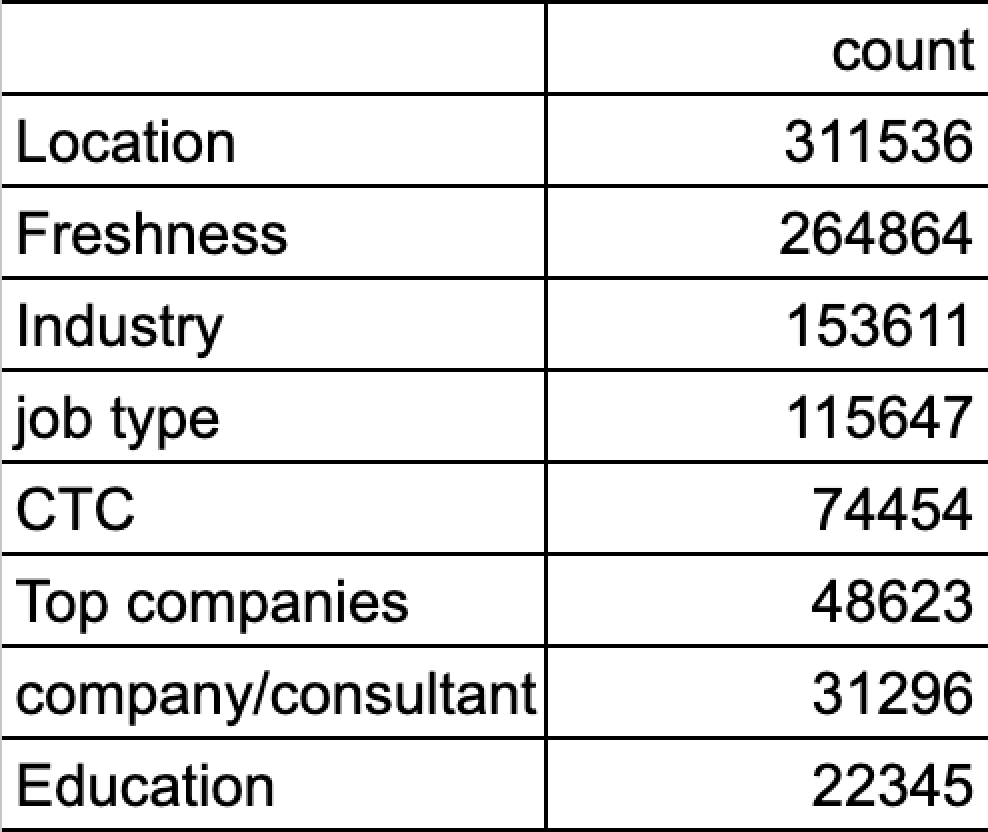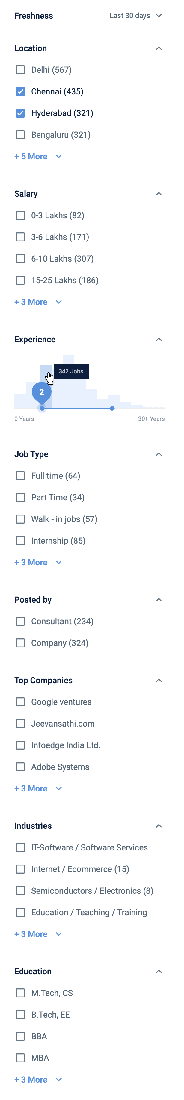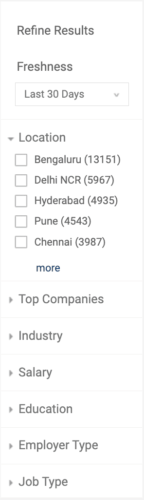 All parameters of advanced search were translated into filters- keyskill,location,work ex, salary,industry, job category