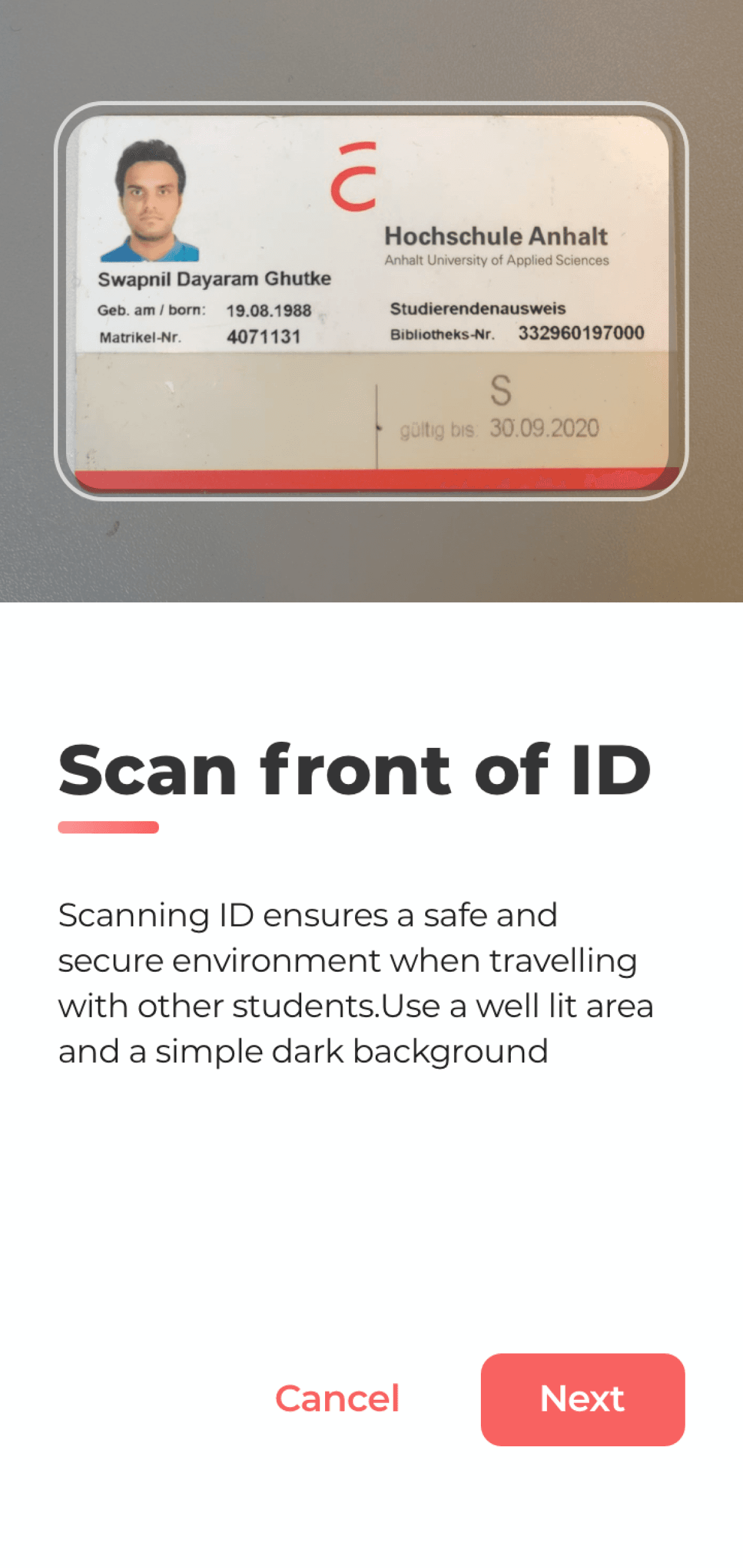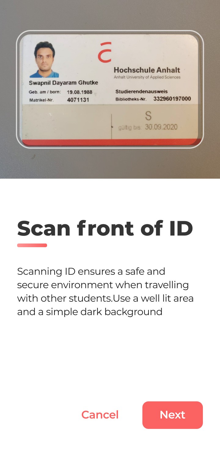 OCR scanner scans the necessary ID information to maintain trust amongst student users.