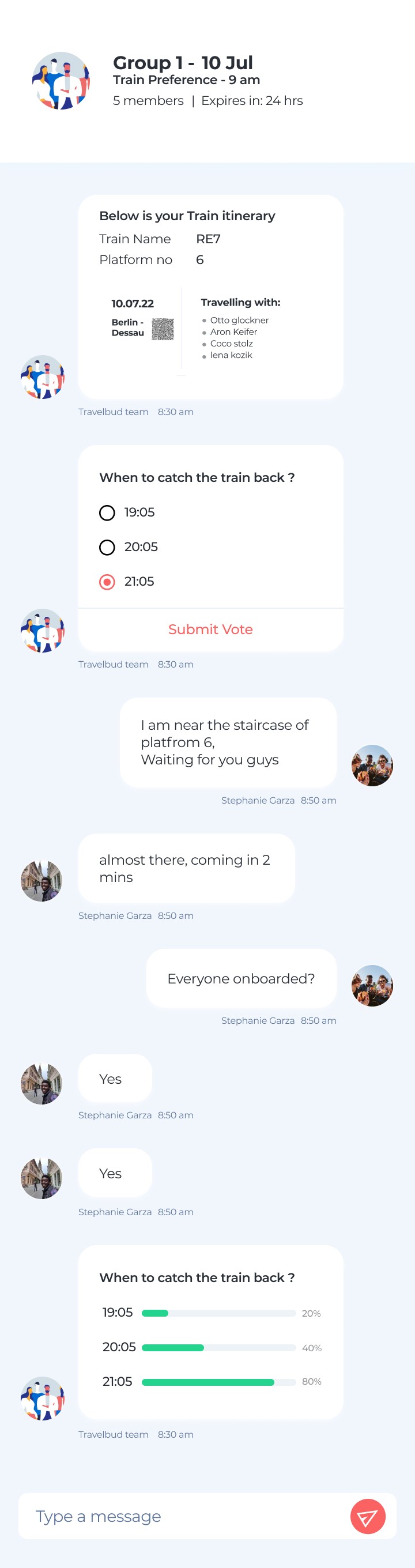 For the group ticket holders of five random university students travelling , a group chat is generated for better coordination.