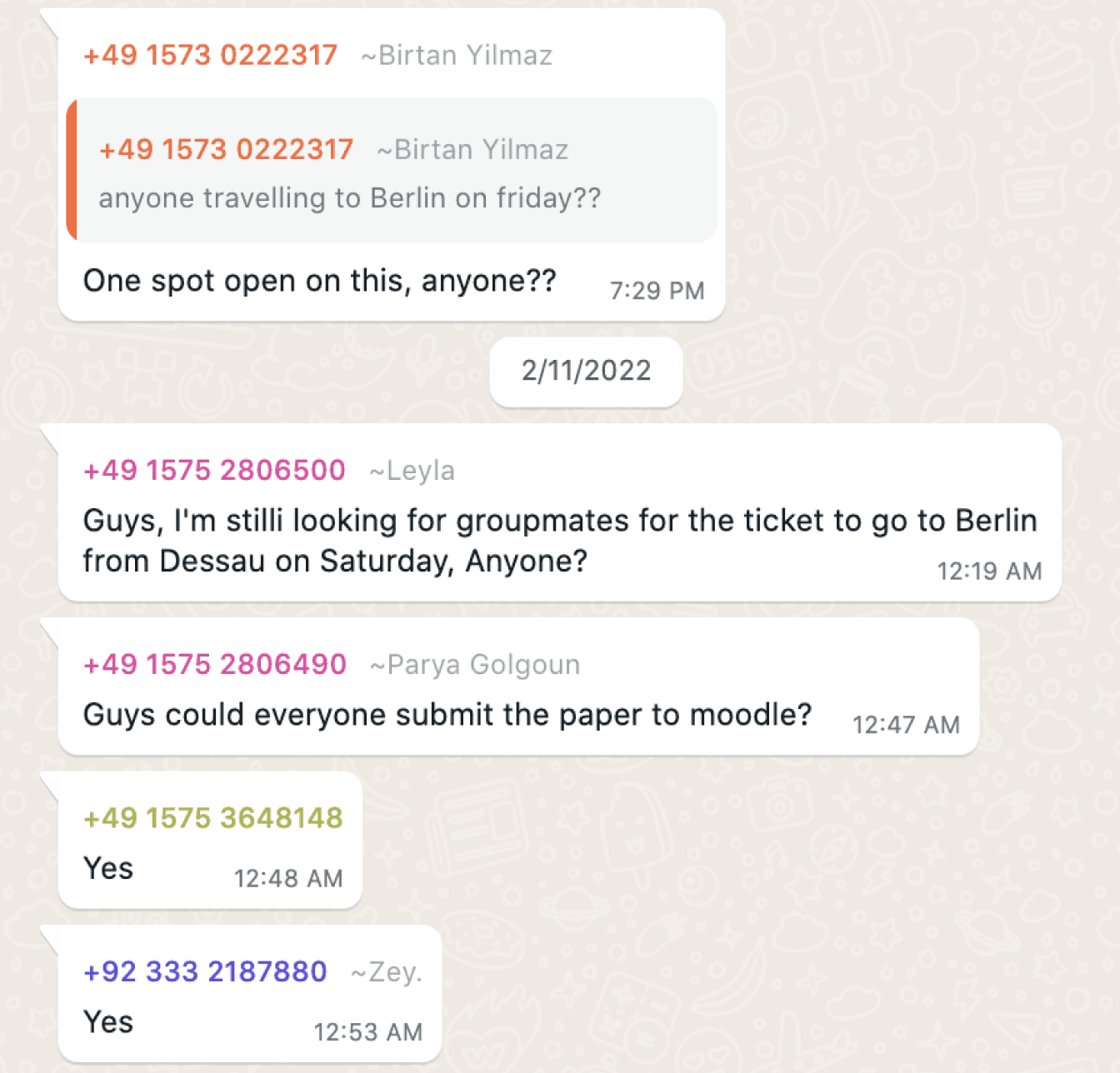 This group chat can be used to decide train station meeting points, train boarding time & deciding return journey times.